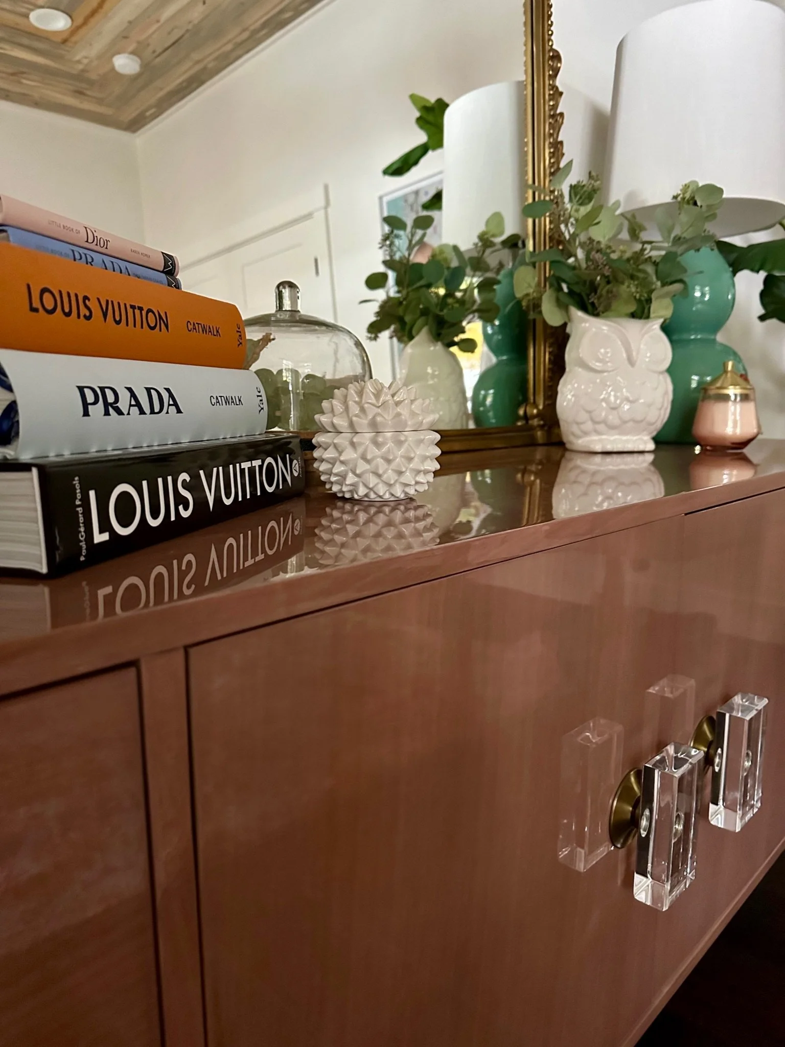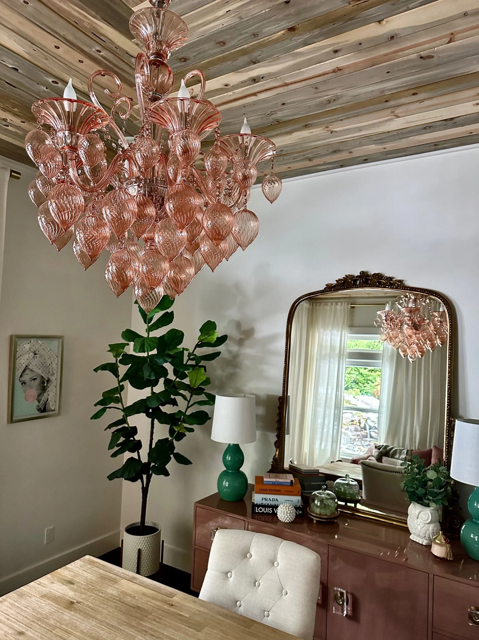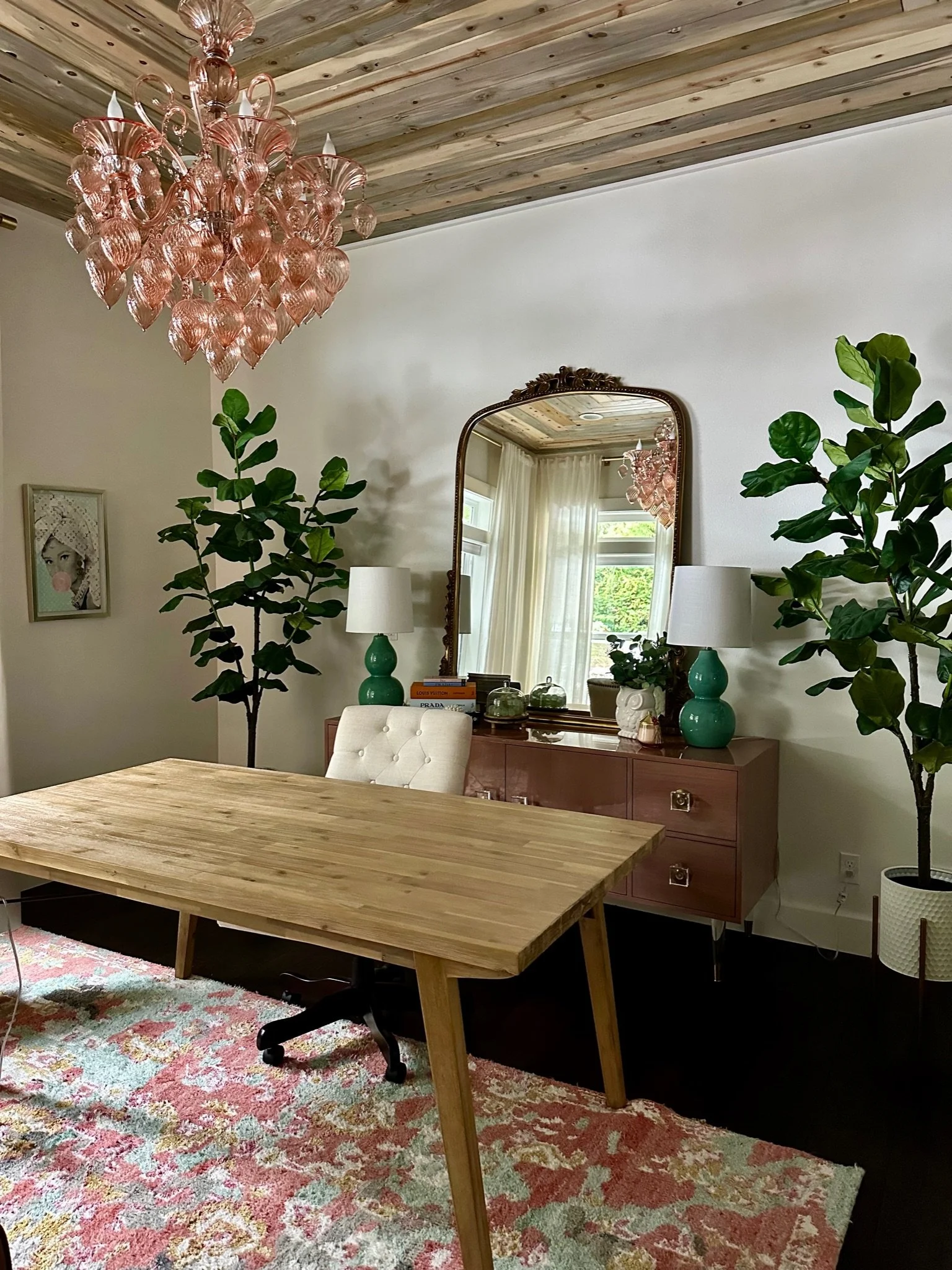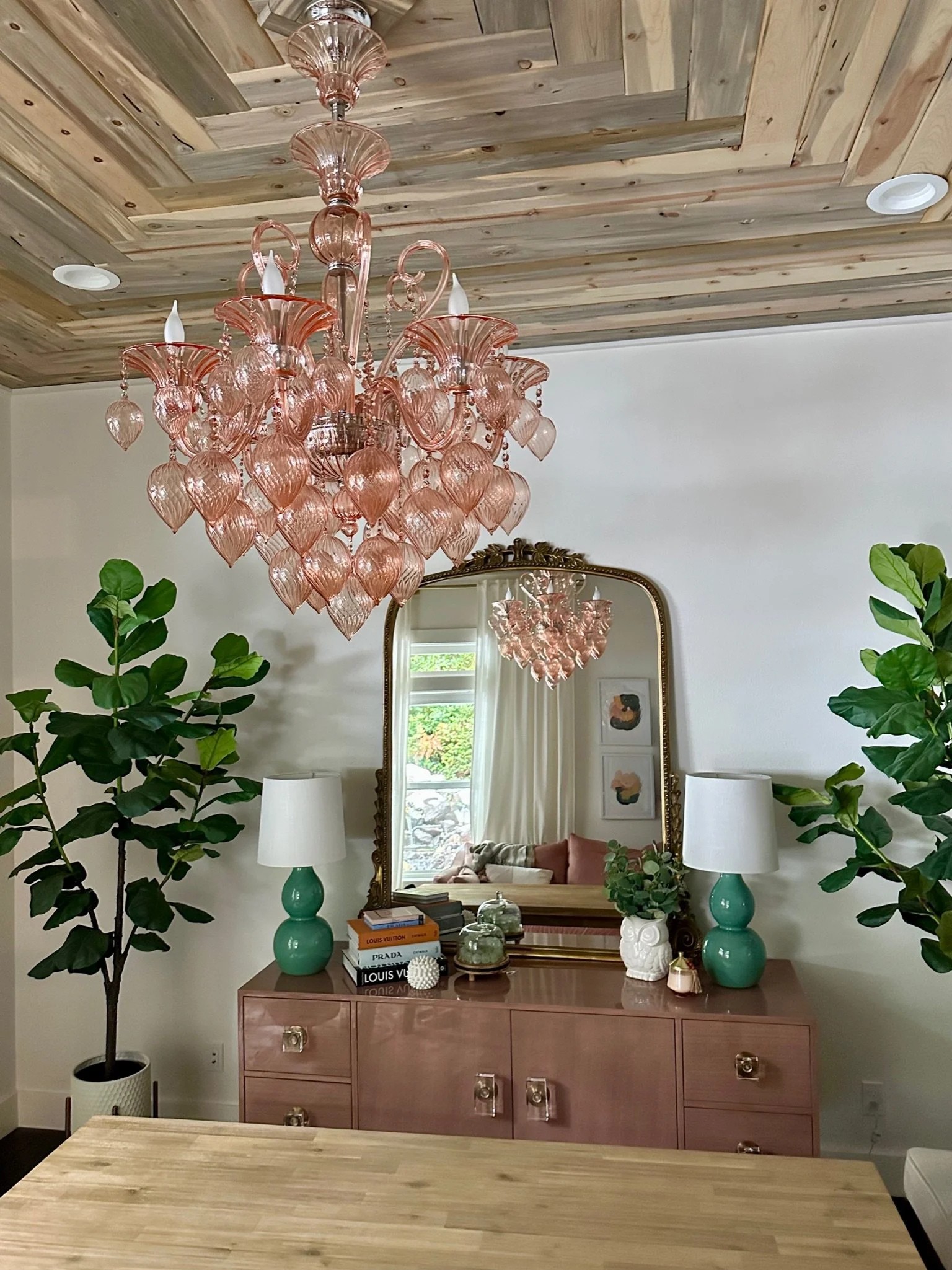 Fearless. Hardworking. Glamorous. Describes our client and her home office. The design blends unapologetically feminine elements—pink lacquer, velvet, arched mirrors—with strong, architectural details and bold textures like beetle pine ceilings. Lighting, extravagant scale, and material choices are used strategically to balance softness with presence. Each subsequent space combines elegance with command, creating a home that is both fierce and feminine.