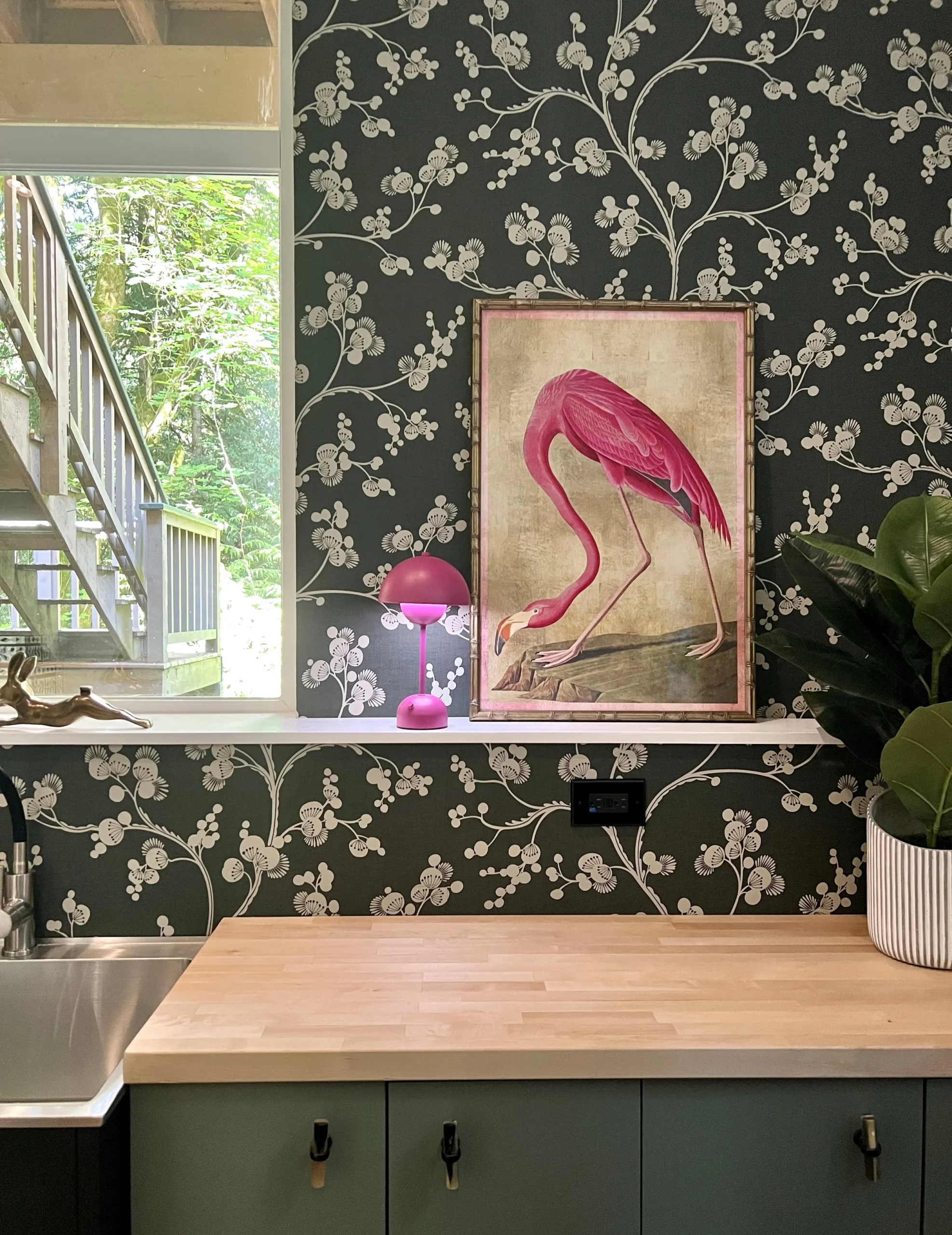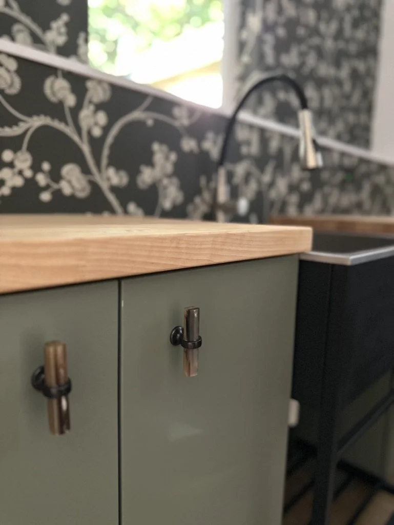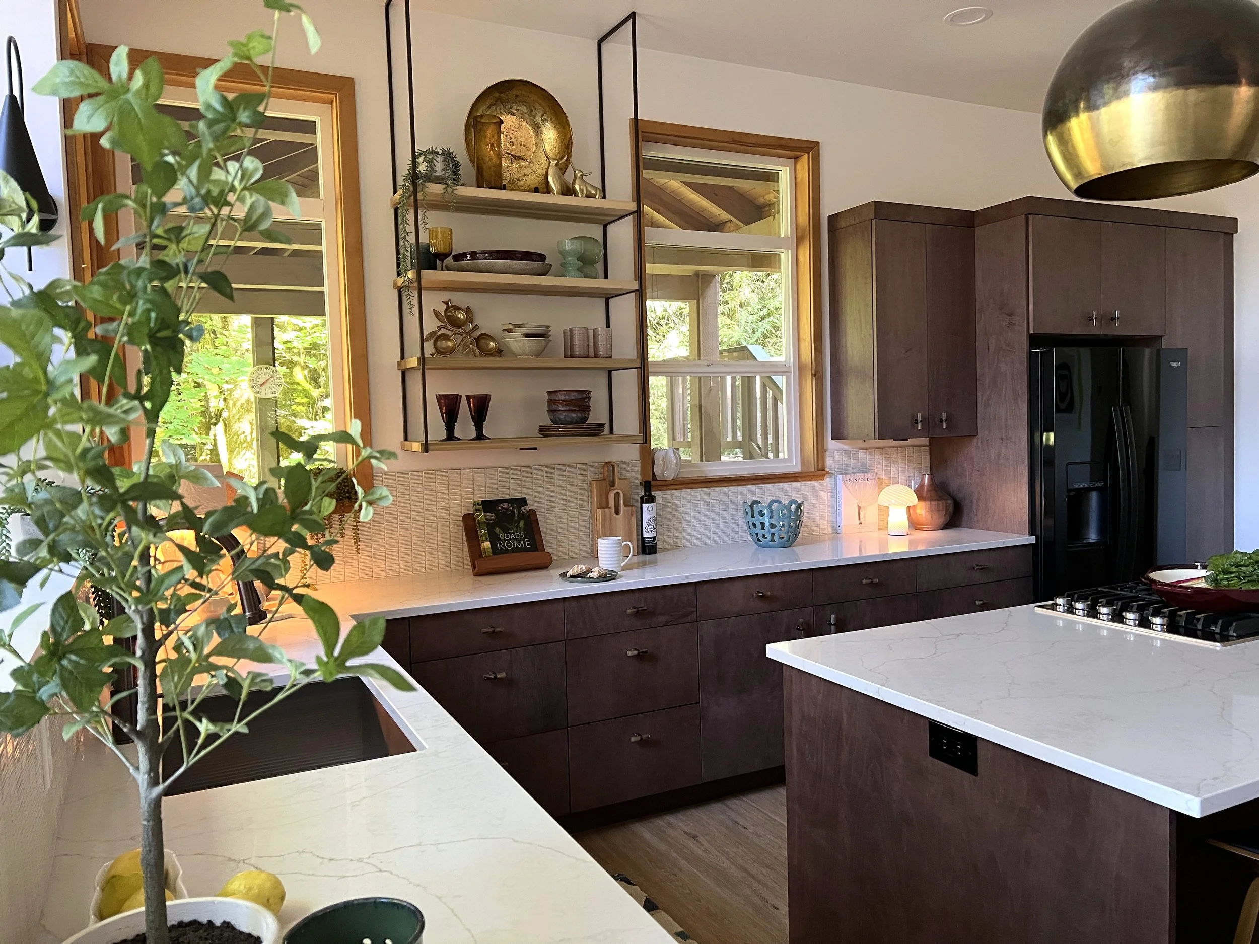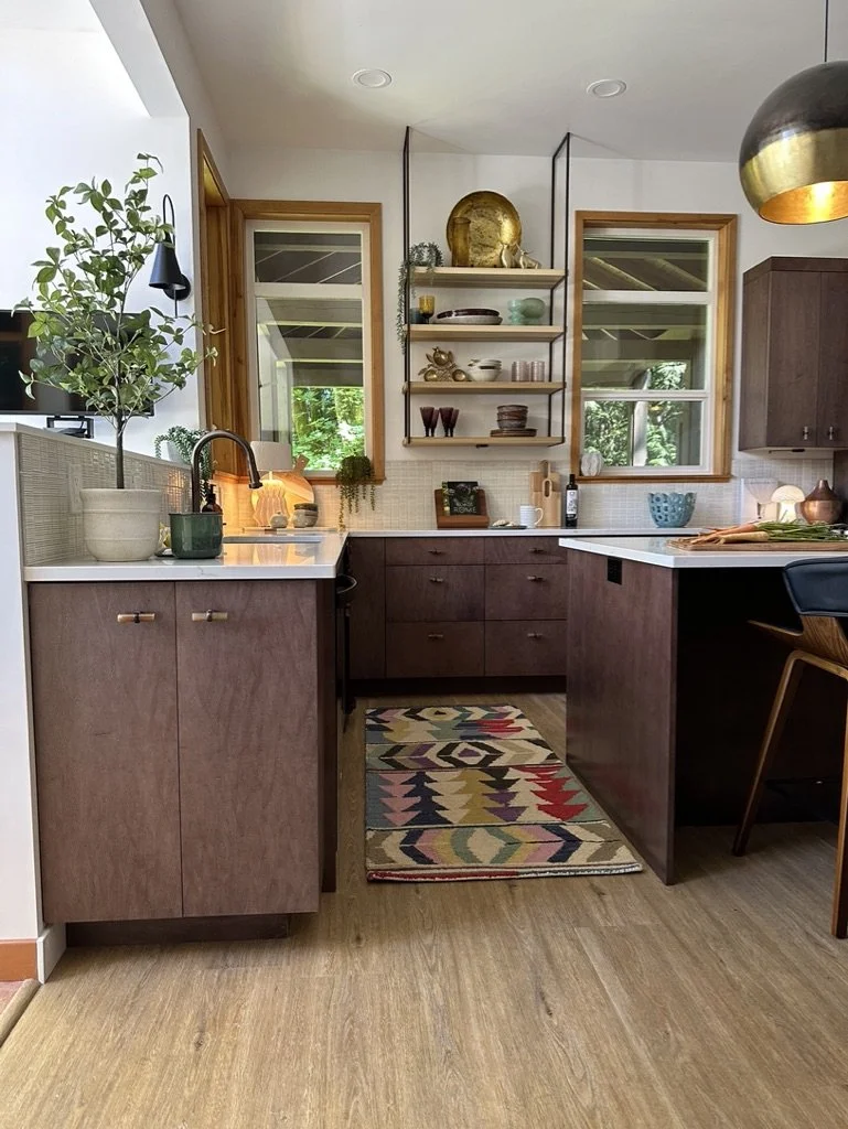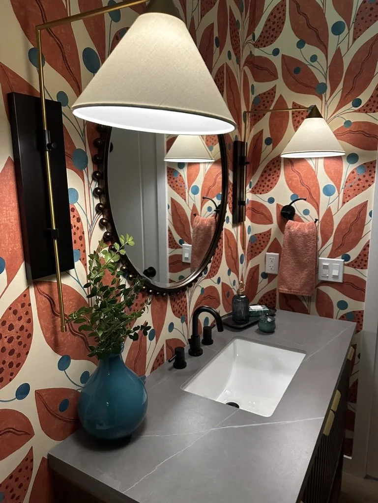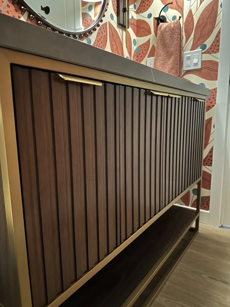 When your partner purchases a second home that you’ve never seen IRL, some tender-loving remodeling may ensue. The kitchen’s slab-front walnut cabinetry, patinaed metals, and layered natural textures set the tone for a sophisticated aesthetic. Oversized metal ombré pendants and bone hardware add character and subtle luxury. In the laundry room, rich green cabinetry, bold black wallpaper, and a freestanding utility sink create a stylish, utilitarian charm with a dollop of unexpected playfulness. The hall bath continues the narrative with a slatted wood vanity, modern plumbing fixtures, and bold wallcoverings. LVP flooring and fresh white paint tie the spaces together, delivering a cohesive and elevated design that blends function, comfort, and refined modern style while quietly saving a marriage:)