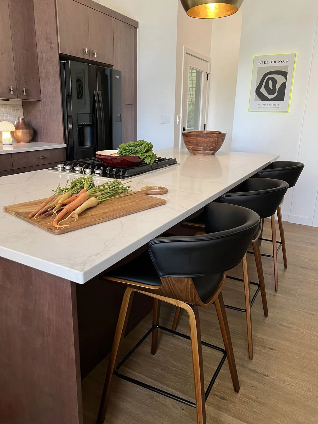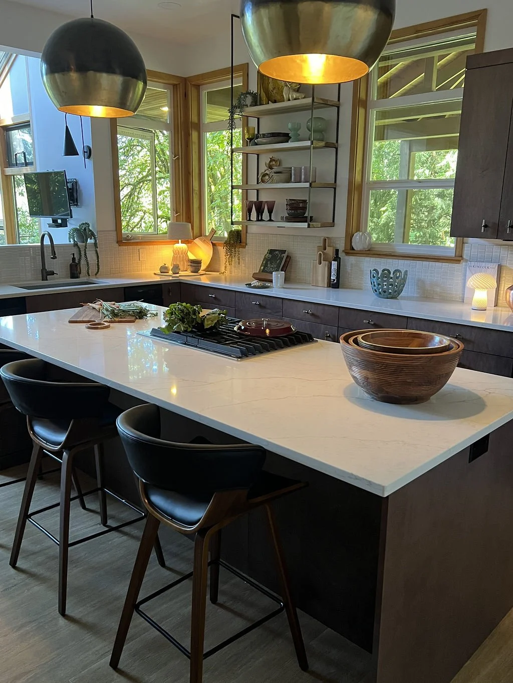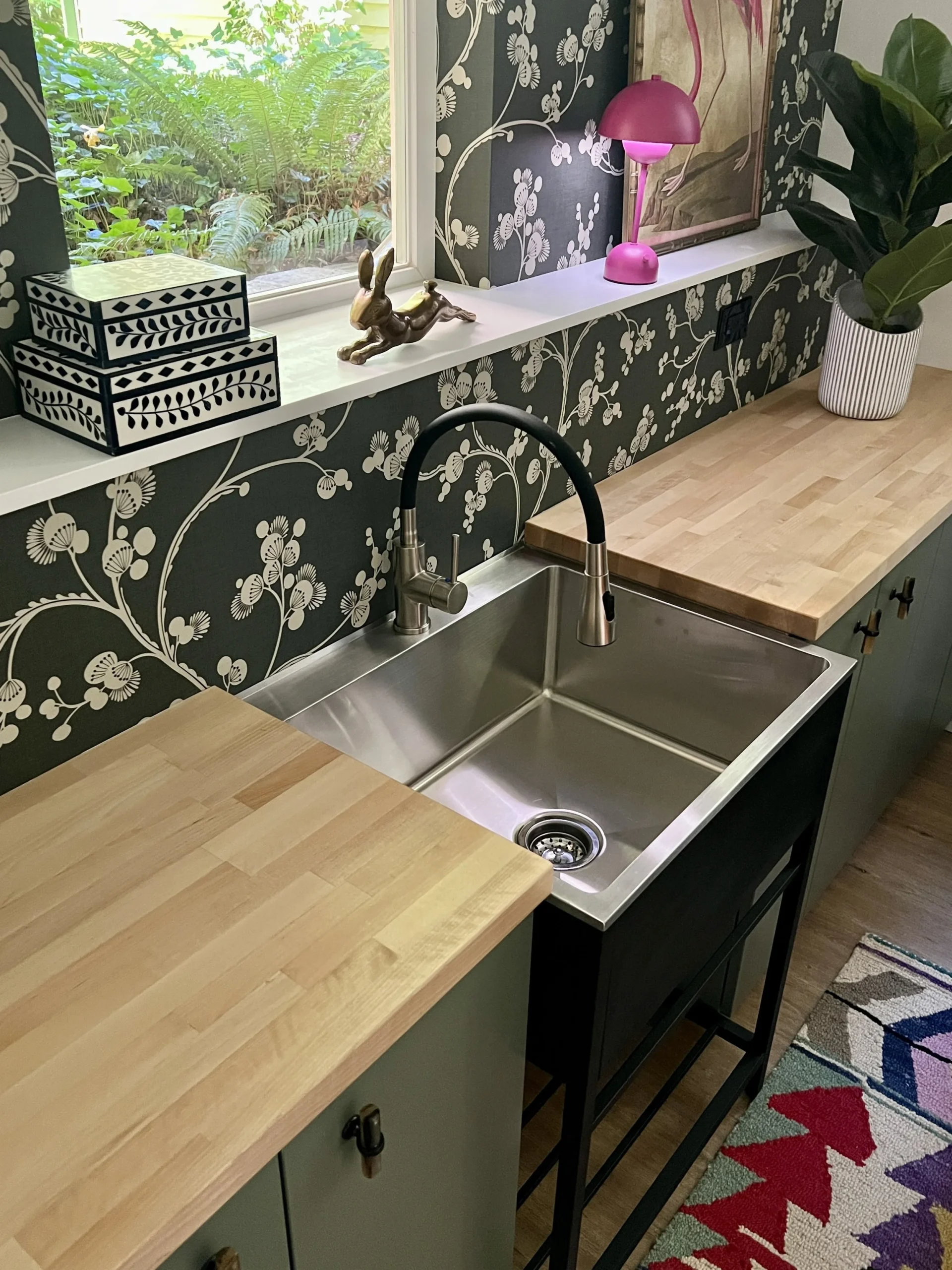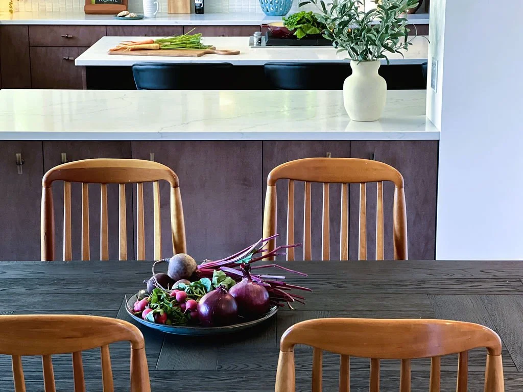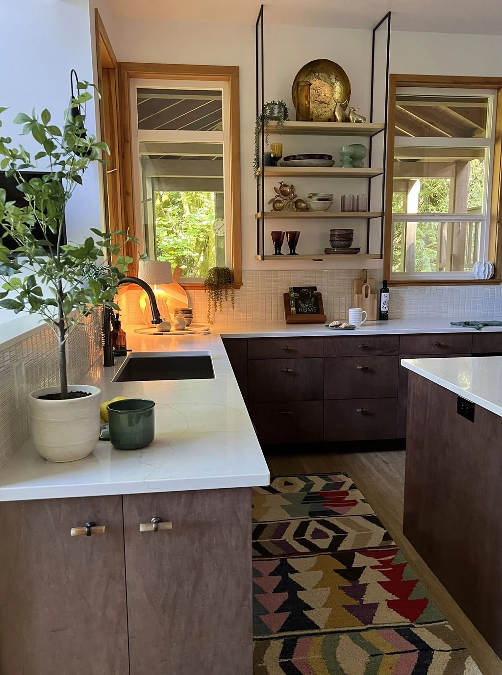When your partner purchases a second home that you’ve never seen IRL, some tender-loving remodeling may ensue. The kitchen’s slab-front walnut cabinetry, patinaed metals, and layered natural textures set the tone for a sophisticated aesthetic. Oversized metal ombré pendants and bone hardware add character and subtle luxury. In the laundry room, rich green cabinetry, bold black wallpaper, and a freestanding utility sink create a stylish, utilitarian charm with a dollop of unexpected playfulness. The hall bath continues the narrative with a slatted wood vanity, modern plumbing fixtures, and bold wallcoverings. LVP flooring and fresh white paint tie the spaces together, delivering a cohesive and elevated design that blends function, comfort, and refined modern style while quietly saving a marriage:)