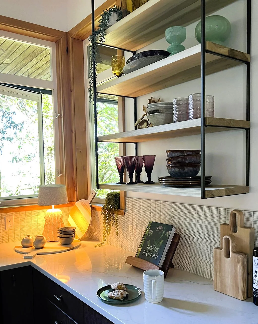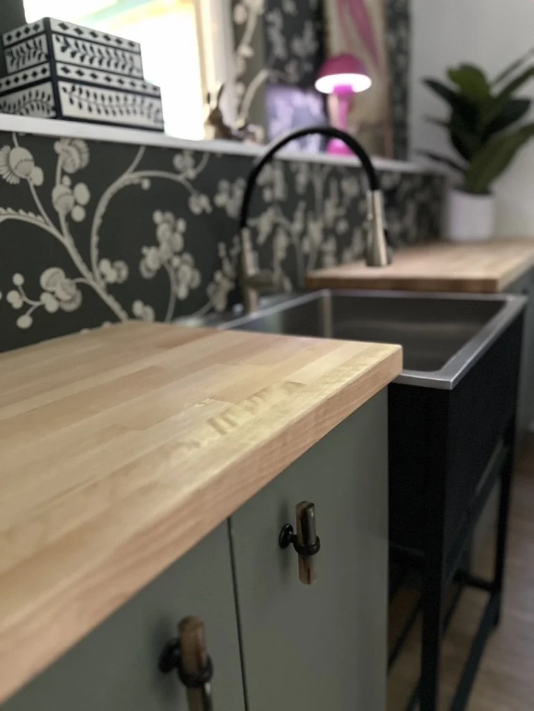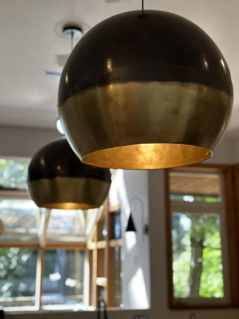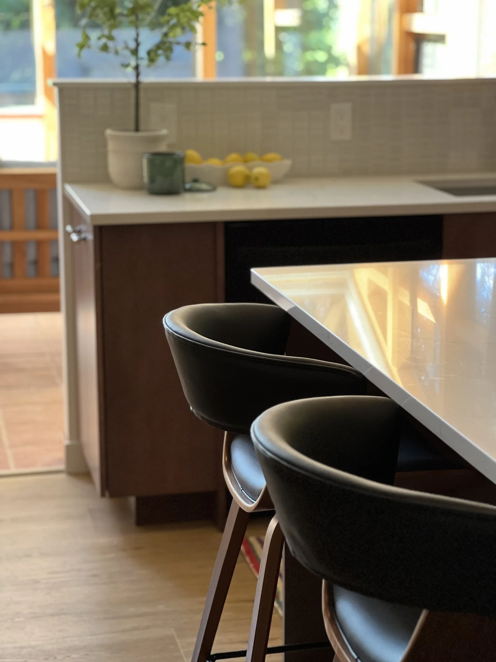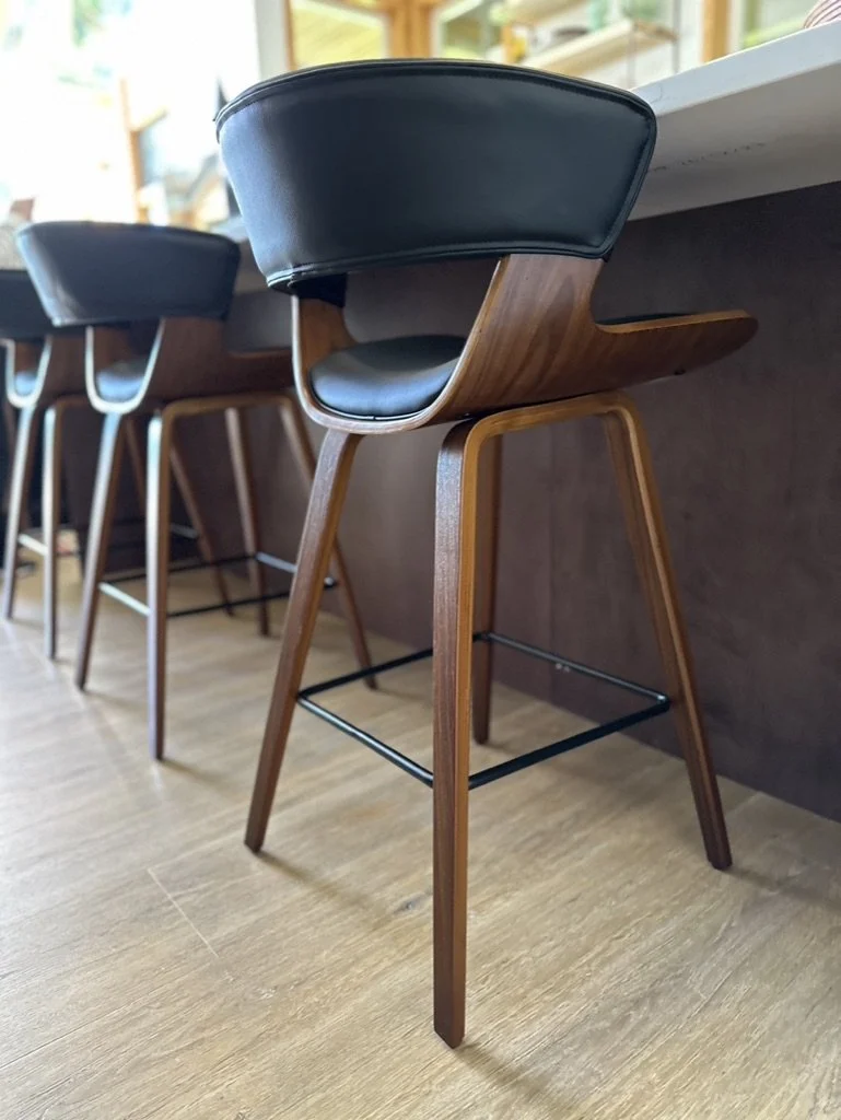When your partner purchases a second home that you’ve never seen IRL, some tender-loving remodeling may ensue. The kitchen’s slab-front walnut cabinetry, patinaed metals, and layered natural textures set the tone for a sophisticated aesthetic. Oversized metal ombré pendants and bone hardware add character and subtle luxury. In the laundry room, rich green cabinetry, bold black wallpaper, and a freestanding utility sink create a stylish, utilitarian charm with a dollop of unexpected playfulness. The hall bath continues the narrative with a slatted wood vanity, modern plumbing fixtures, and bold wallcoverings. LVP flooring and fresh white paint tie the spaces together, delivering a cohesive and elevated design that blends function, comfort, and refined modern style while quietly saving a marriage:)