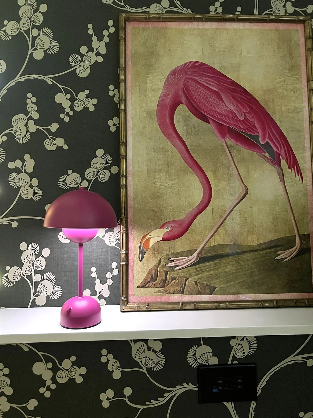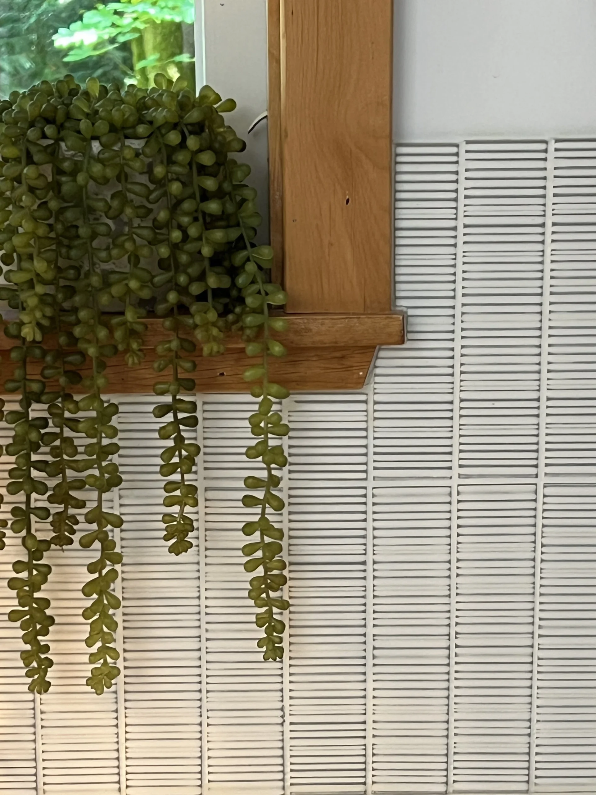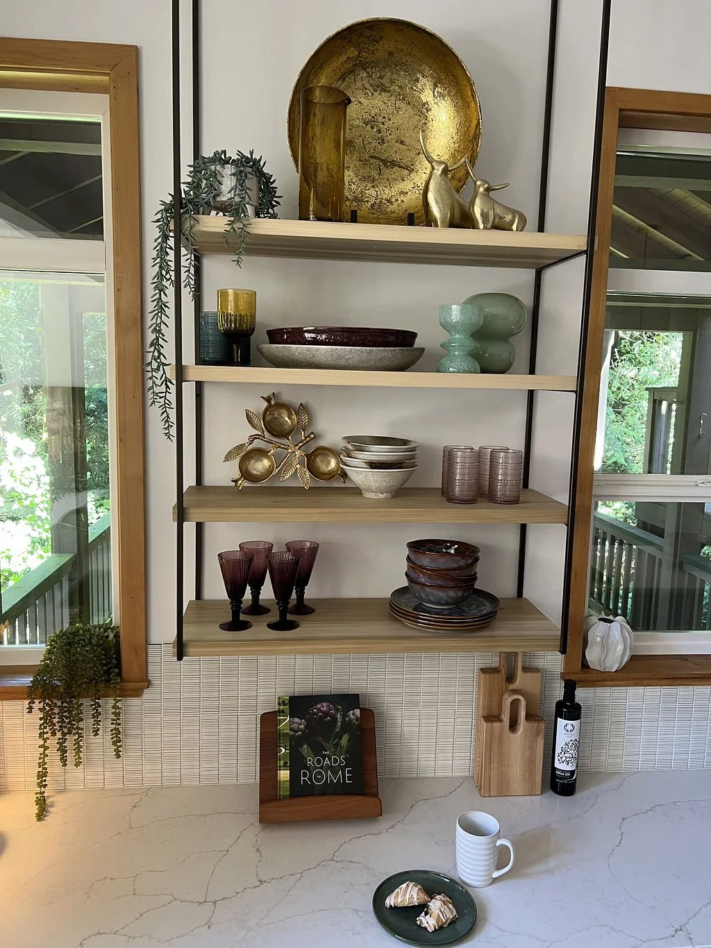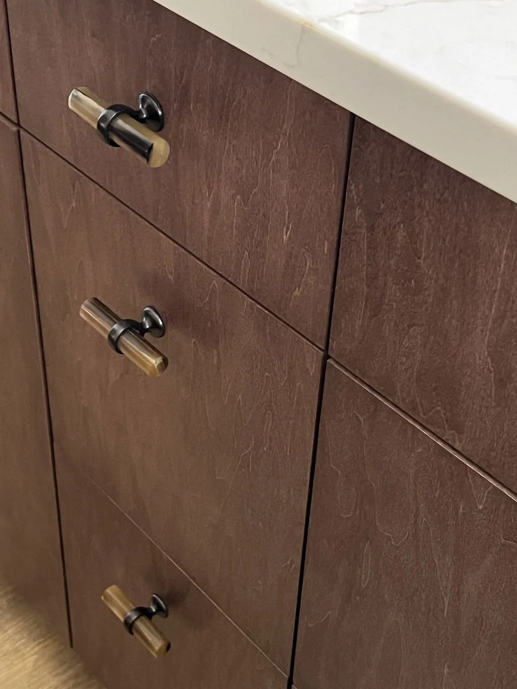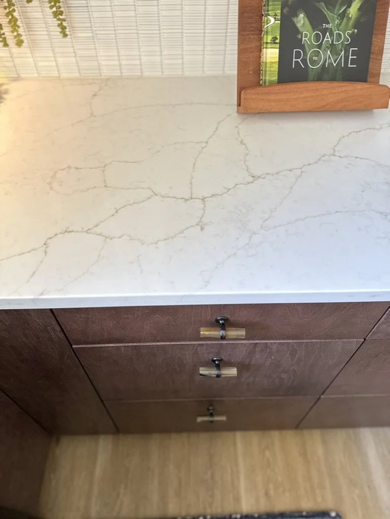 When your partner purchases a second home that you’ve never seen IRL, some tender-loving remodeling may ensue. The kitchen’s slab-front walnut cabinetry, patinaed metals, and layered natural textures set the tone for a sophisticated aesthetic. Oversized metal ombré pendants and bone hardware add character and subtle luxury. In the laundry room, rich green cabinetry, bold black wallpaper, and a freestanding utility sink create a stylish, utilitarian charm with a dollop of unexpected playfulness. The hall bath continues the narrative with a slatted wood vanity, modern plumbing fixtures, and bold wallcoverings. LVP flooring and fresh white paint tie the spaces together, delivering a cohesive and elevated design that blends function, comfort, and refined modern style while quietly saving a marriage:)