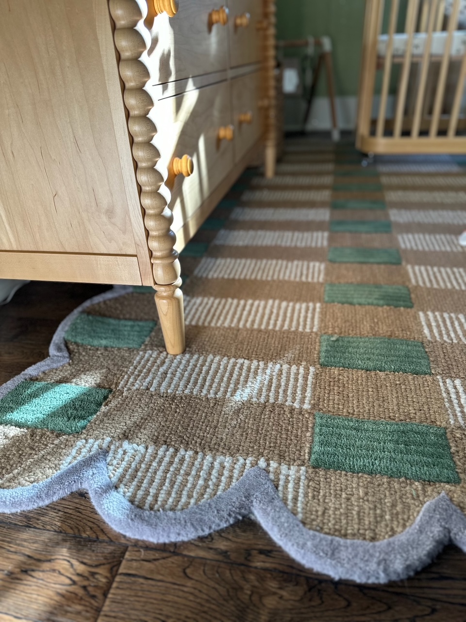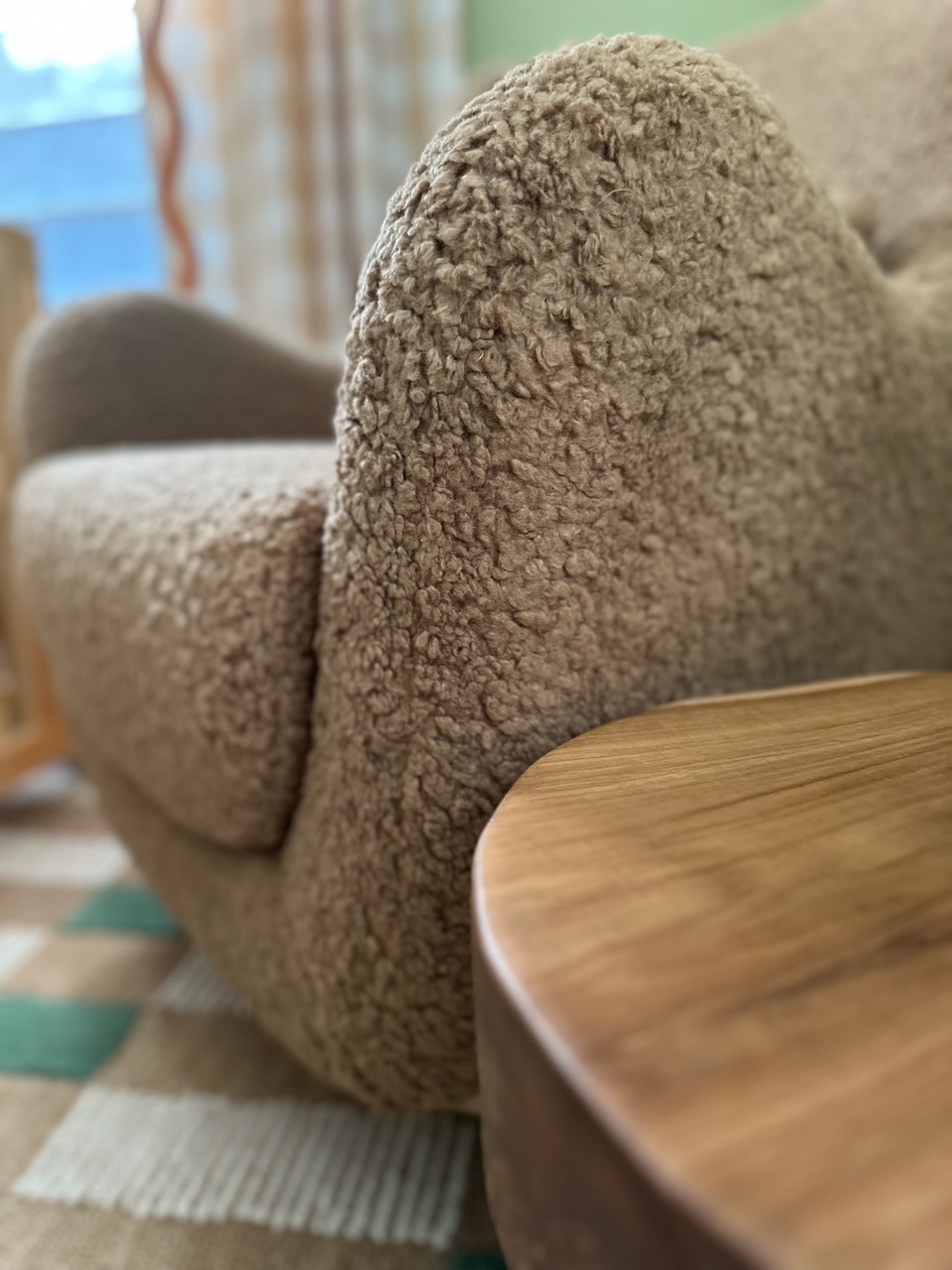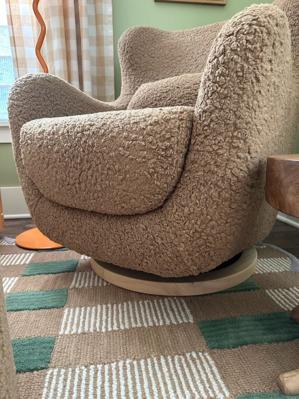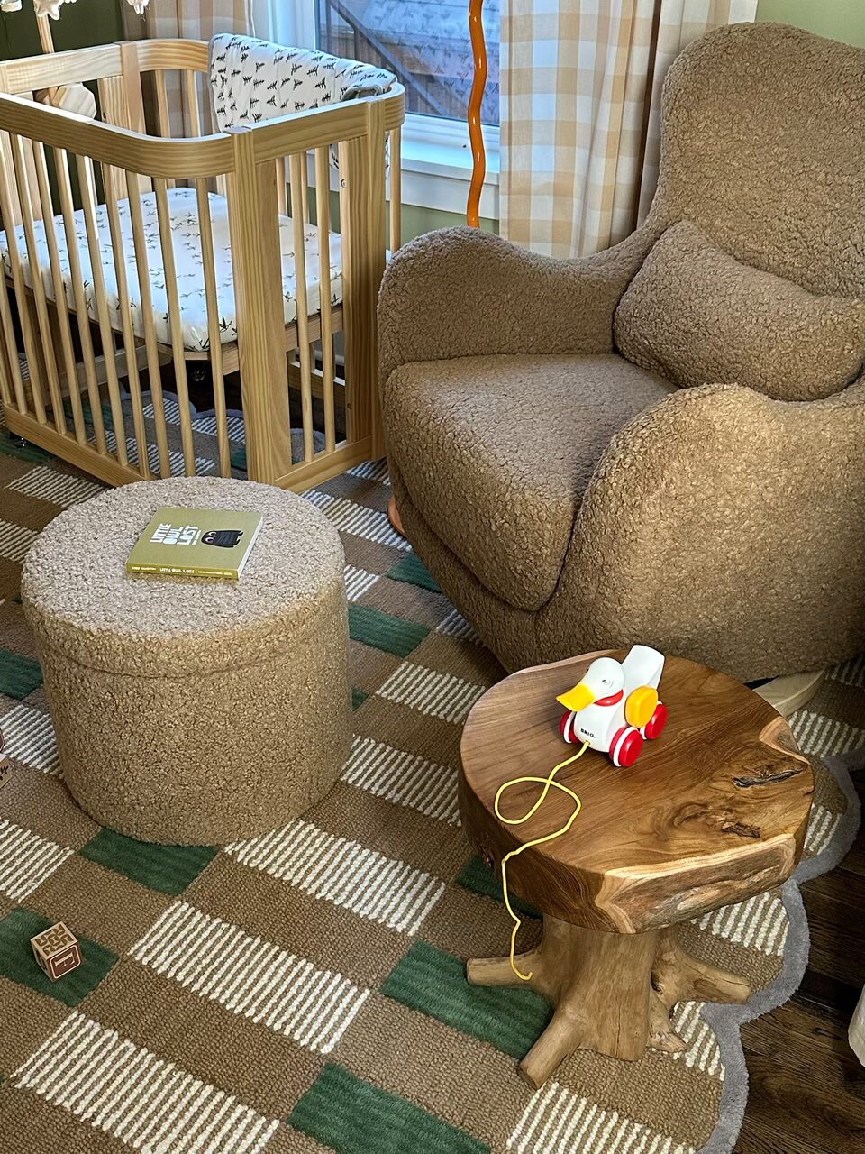 A playful plaid scalloped rug introduces texture, while an oversized teddy-bear of a boucle swivel chair provides a cozy “hug” for both parent and baby. A curvy floor lamp in a glossy pop of orange adds a modern counterpoint, and a glowing moon doubles as nightlight and art, casting a soft, enchanting light. We layered in buffalo-check curtain panels, a spindle-detailed blond-wood dresser/changing table, a wood “root” side table and a curved convertible crib designed to seamlessly evolve into a toddler bed.