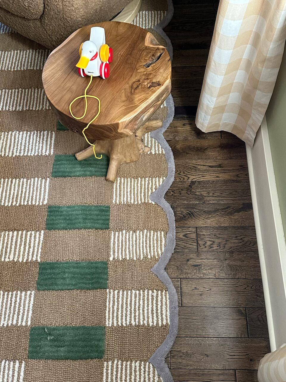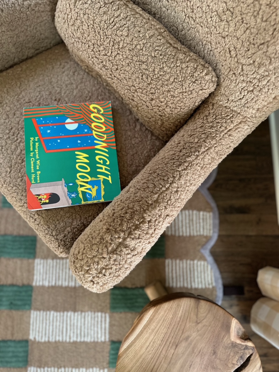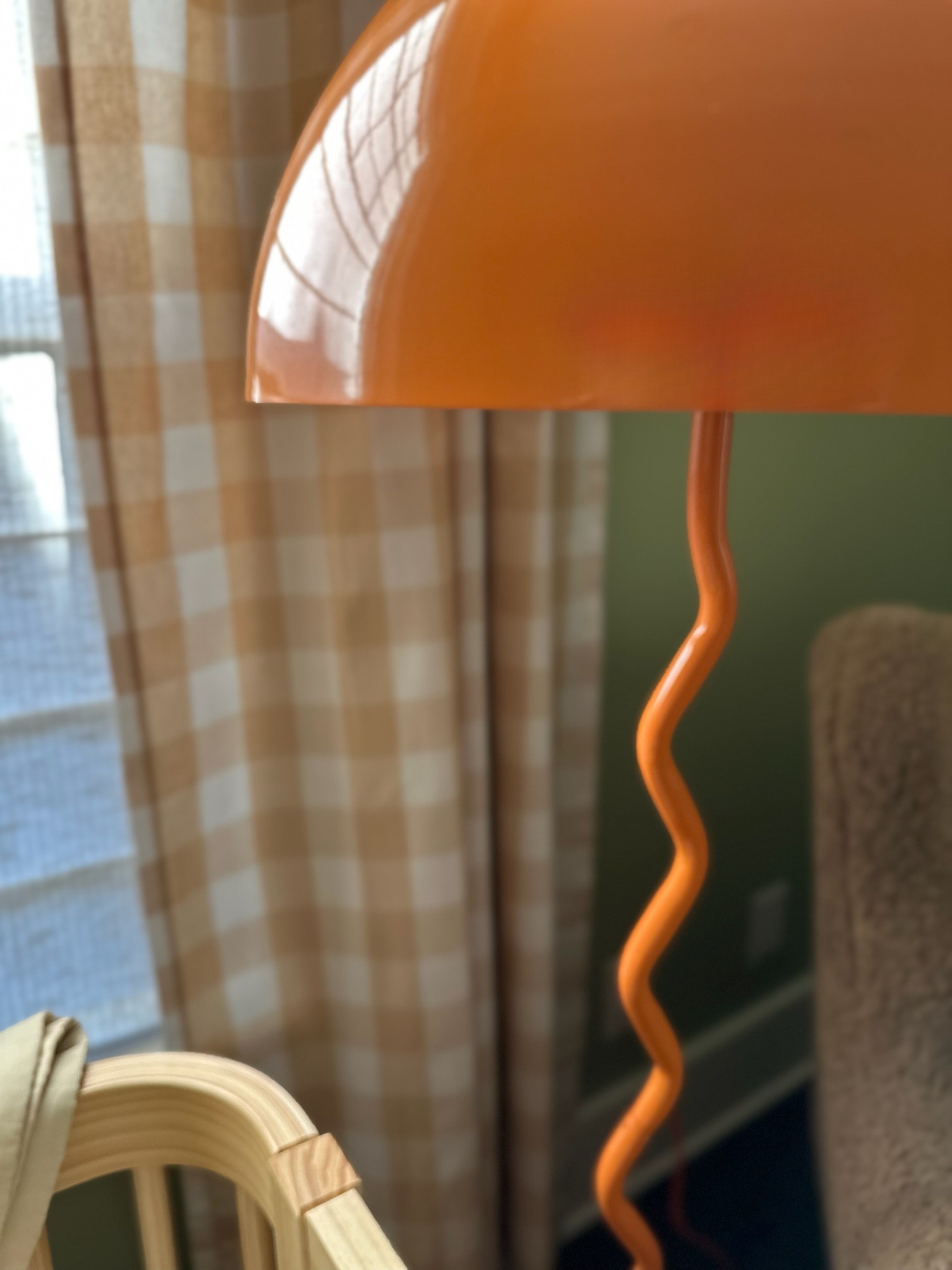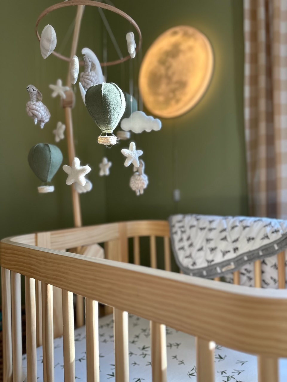 A playful plaid scalloped rug introduces texture, while an oversized teddy-bear of a boucle swivel chair provides a cozy “hug” for both parent and baby. A curvy floor lamp in a glossy pop of orange adds a modern counterpoint, and a glowing moon doubles as nightlight and art, casting a soft, enchanting light. We layered in buffalo-check curtain panels, a spindle-detailed blond-wood dresser/changing table, a wood “root” side table and a curved convertible crib designed to seamlessly evolve into a toddler bed.