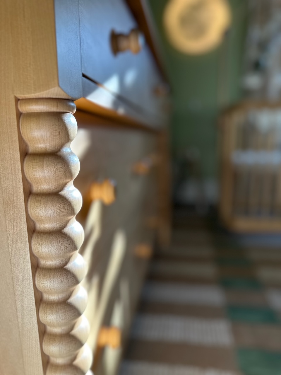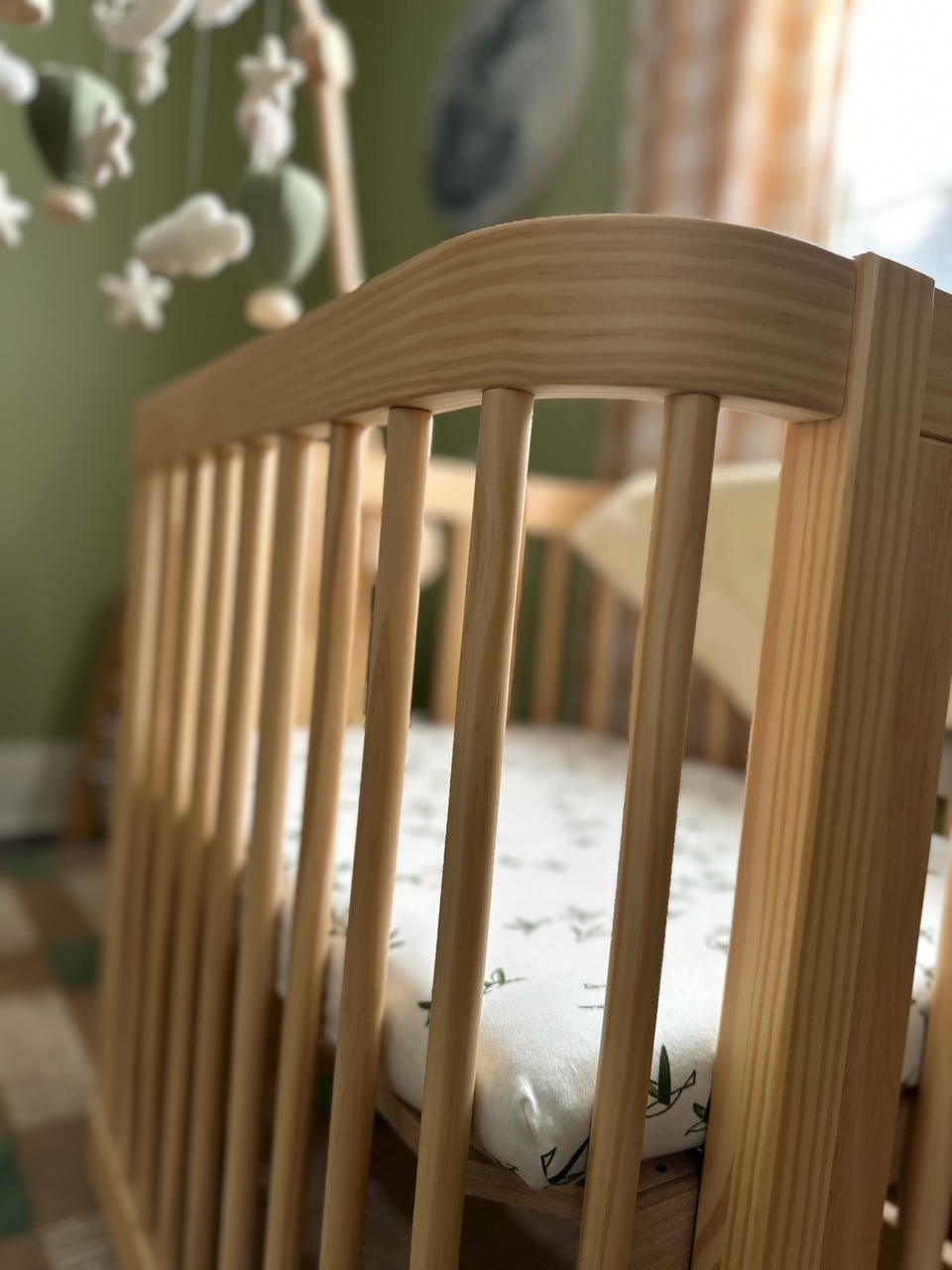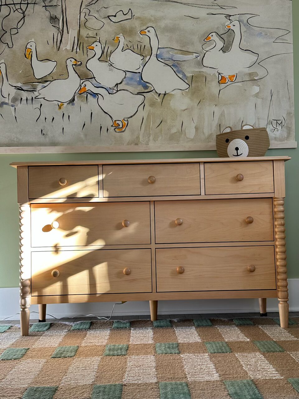 For our clients’ first baby, a boy, we began with a whimsical goose canvas wall hanging to shape the color palette and set the gentle, storybook character of the room. Its tones harmonized beautifully with the existing green-painted walls, dark-stained floors, classic white casings, and window treatments.